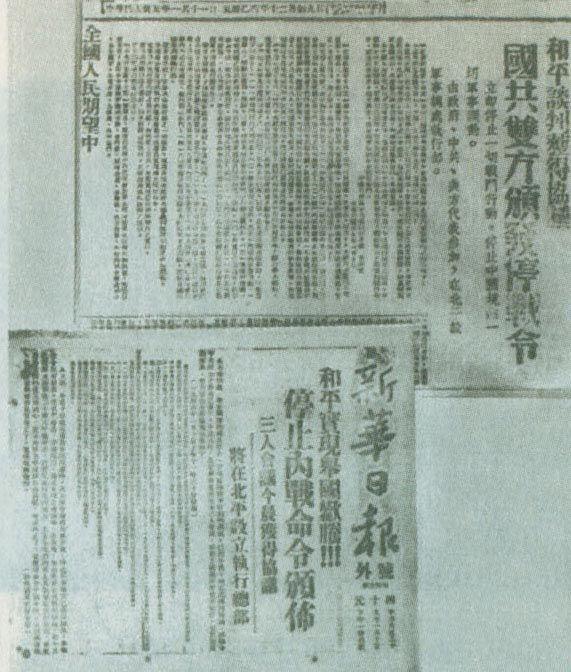 ↑1946年1月10日,《解放日報》和《新華日報》關(guān)于國共雙方頒布停戰(zhàn)令的報道。