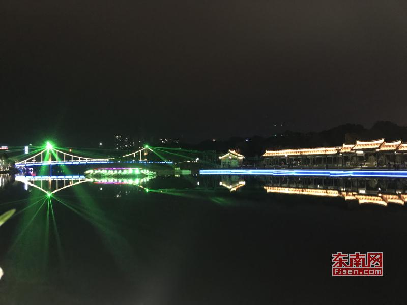 游人如織的星光隧道 據(jù)了解,星光隧道采用了地面互動投影項(xiàng)目技術(shù),隧道地面會出現(xiàn)水波蕩漾、3D游魚、荷塘花葉等各種特效影像,游人走在隧道內(nèi)時,通過肢體動作與投影幕上的虛擬場景進(jìn)行交互,互動效果就會隨著腳步移動而產(chǎn)生相應(yīng)的變幻,市民可以體驗(yàn)其中的新奇感。 沿著延壽溪畔漫步,沿岸綠道、綠化帶、亭臺廊榭、水岸、棧道及橋身等被那五彩繽紛的燈光打扮,火樹銀花、燈水交融,炫目耀眼的燈光倒映在水面上,一幅流光溢彩的畫廊景象躍然眼前。夜幕下,泗華古橋、過溪橋、延壽古橋、古建筑等在燈光線條的勾勒下,呈現(xiàn)出歷史與現(xiàn)代相互交融的夜景韻味。 “泗華溪和綬溪公園原先就景色很美,是散步休閑的好地方,現(xiàn)在通過燈光技術(shù)調(diào)節(jié),夜里燈火輝煌,這幾天夜里走過來每天都感覺人擠人?!奔易↓垬蚪值琅d安社區(qū)的居民林女士說,她家里離綬溪公園不遠(yuǎn),平日里便經(jīng)常會到公園里散步,春節(jié)期間和家人好友過來,明顯感覺到公園里人氣更旺了許多。